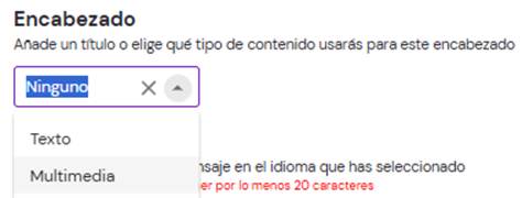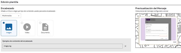 Al seleccionar la opción “Multimedia”, se habilita la posibilidad de añadir una imagen, video o documento como encabezado de la plantilla. También es posible visualizar un ejemplo de cómo se verá en la versión final.