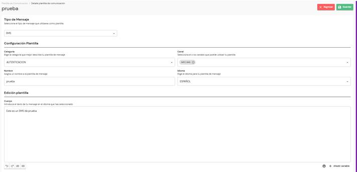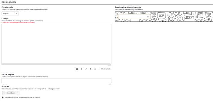 En el apartado del cuerpo de la plantilla, se puede redactar el contenido principal del mensaje. Además, se cuenta con un editor de texto que permite aplicar formato, como negrita, cursiva y subrayado, así como añadir variables.