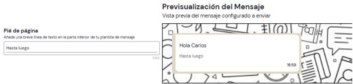 Luego tenemos el pie de página, que permite añadir una breve línea de texto a la plantilla. Este campo tiene un límite de 60 caracteres y suele utilizarse para incluir información complementaria o legal.