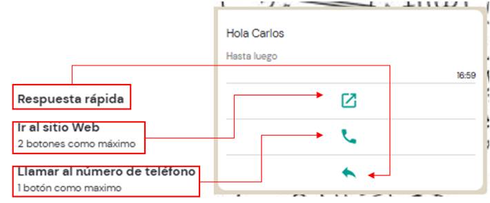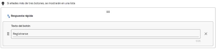 • Texto del botón: Frase o palabra que el usuario verá y podrá seleccionar como respuesta inmediata (ej. “Quiero más información”).