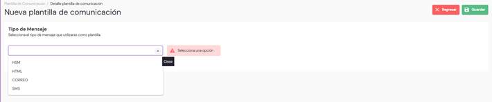 Al hacer clic en el botón “Registrar”, se deberá seleccionar el tipo de plantilla que se desea crear: HSM, HTML, correo electrónico o SMS.
