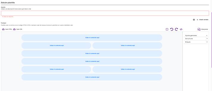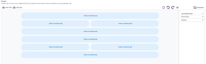 En la parte superior izquierda, tienes la opción de cargar archivos propios de HTML y CSS para personalizar completamente la estructura visual de tu plantilla.