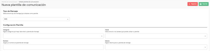 Para crear una plantilla de comunicación de tipo SMS, primero debes completar los campos requeridos: la categoría, que describe el propósito de tu plantilla (ya sea autenticación, marketing, utilidad o ninguna); el canal, que indica los medios por los cuales se podrá utilizar la plantilla; el nombre de la plantilla; y el idioma en el que se redactará.