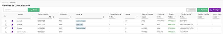Las plantillas de comunicación sirven para enviar un mensaje estructurado al cliente. Se originará una nueva plantilla, usando el botón de registrar y para eliminarla seleccionamos la casilla blanca y pulsamos el botón de eliminar.