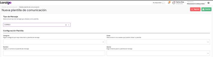 Para crear una plantilla de comunicación de tipo HTML, primero debes completar los campos requeridos: