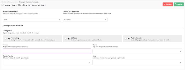 Para crear una plantilla de comunicación de tipo HSM, primero debes completar los campos requeridos: