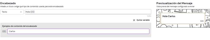 Al seleccionar la opción “Texto”, se habilita la posibilidad de añadir un encabezado a la plantilla y utilizar variables. También es posible visualizar un ejemplo de cómo se verá la plantilla final.