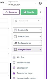 Finalmente, en la parte derecha de la pantalla, se encuentra el panel de cards. Este panel agrupa todas las tarjetas disponibles para construir o editar un flujo conversacional. Las cards están organizadas en cuatro categorías principales: contenido, que permite mostrar información al usuario; interacción, que sirve para recopilar datos o respuestas; redirecciones, que conectan el flujo con otros bloques o bots; e integraciones, que facilitan la conexión con sistemas externos o servicios mediante API.