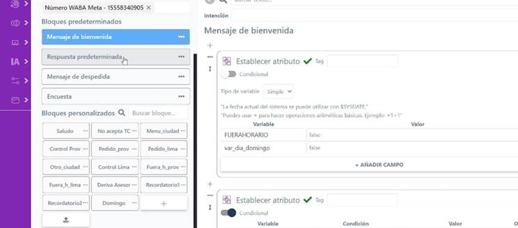 Los bloques representan las secciones o etapas que conforman el flujo conversacional. Cada bloque agrupa un conjunto de acciones y respuestas que el bot ejecutará durante la interacción con el usuario. Se pueden encontrar bloques predeterminados, como el mensaje de bienvenida o la respuesta general, y también bloques personalizados que permiten diseñar diálogos a la medida.