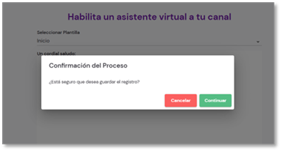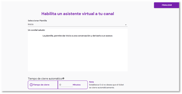 Laraigo mostrará la opción de habilitar un asistente virtual por defecto 🤖, el cual funciona como una plantilla que permite iniciar una conversación y derivarla a un asesor. Para utilizarlo, basta con seleccionar la plantilla; sin embargo, esta opción también puede omitirse en caso de que se prefiera realizar una configuración personalizada desde el módulo de Diseñador de Bots. En cualquiera de los casos, debemos hacer clic en el botón Finalizar ✅ para completar el proceso.