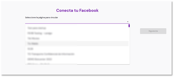 Una vez que hayas iniciado sesión en Facebook con tu cuenta personal, Laraigo mostrará un listado de todas las páginas que administras. Revisa cuidadosamente la lista y selecciona la página de tu negocio que deseas conectar. Después de elegirla, haz clic en el botón Siguiente para continuar.