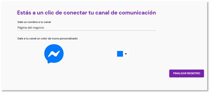 Ahora, asigna un nombre a tu canal de negocio dentro de Laraigo. Este nombre te permitirá identificar fácilmente tu canal de Facebook Messenger en la plataforma y diferenciarlo de otros canales que puedas tener configurados. Una vez elegido el nombre, continúa haciendo clic en Finalizar Registro.