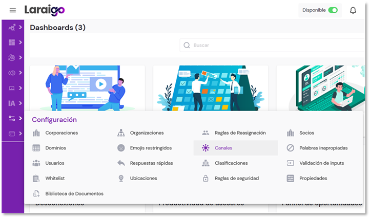 Una vez que hayas iniciado sesión en Laraigo, dirígete al módulo de Configuración y selecciona la opción Canales.