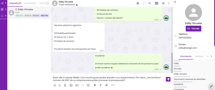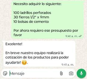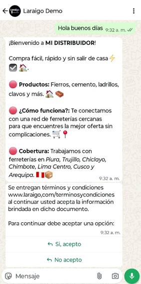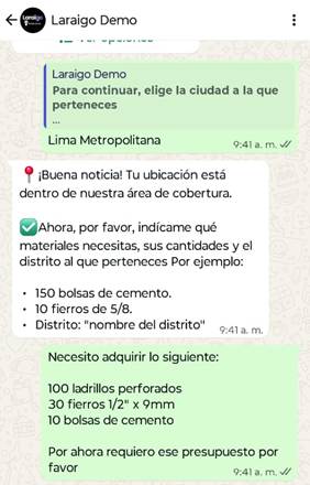 La empresa es una distribuidora de materiales de construcción que utiliza un chatbot creado con el diseñador de bots de Laraigo para gestionar de manera más eficiente las solicitudes de pedidos y cotizaciones de sus clientes. El flujo de atención está diseñado con base en las reglas del negocio y los horarios de atención establecidos, de lunes a sábado de 08:00 a 5:30 pm.