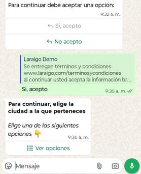 - Según la elección, se despliega un menú en WhatsApp con la lista de ciudades disponibles correspondientes a la opción elegida.